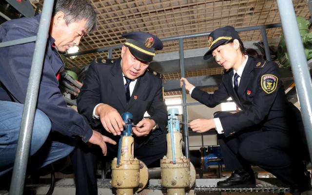 执法人员现场对两台九游J9(中国)的安全附件进行检查确认。东城市场监管局供图